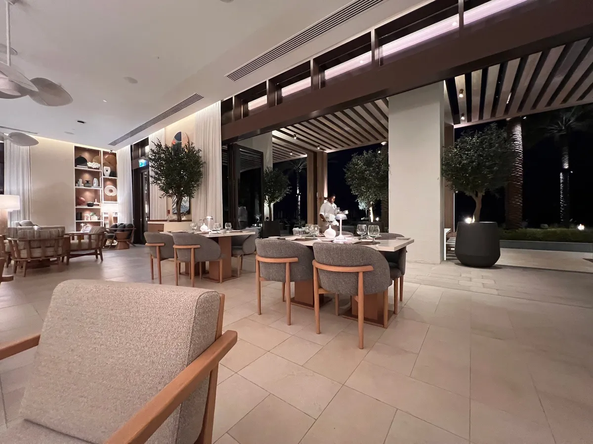 Anwa is the signature dining room at The Palace Beach Resort Fujairah, a beachfront restaurant set directly on the sand with a considered contemporary design that leans more towards Dubai boutique than east-coast resort. The setting alone makes it a destination address on this stretch of the coast - the view of the Gulf is uninterrupted, the open-air terrace catches the evening breeze, and the interior pairs warm lighting with clean lines.