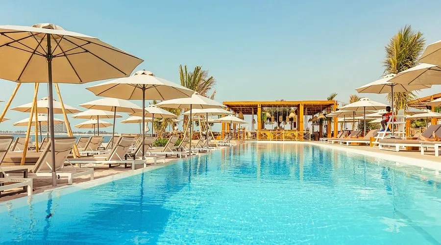 Ula Beach RAK is the Marjan Island outpost of the Dubai original - a polished, sand-on-your-feet beach club set inside the Mövenpick Resort on Al Marjan Island. The design language is earthy and Mediterranean, all raw timber, woven shades and low linen-cushioned seating, and the whole room is pulled towards the horizon, which is why it's at its best from late afternoon into the golden hour.