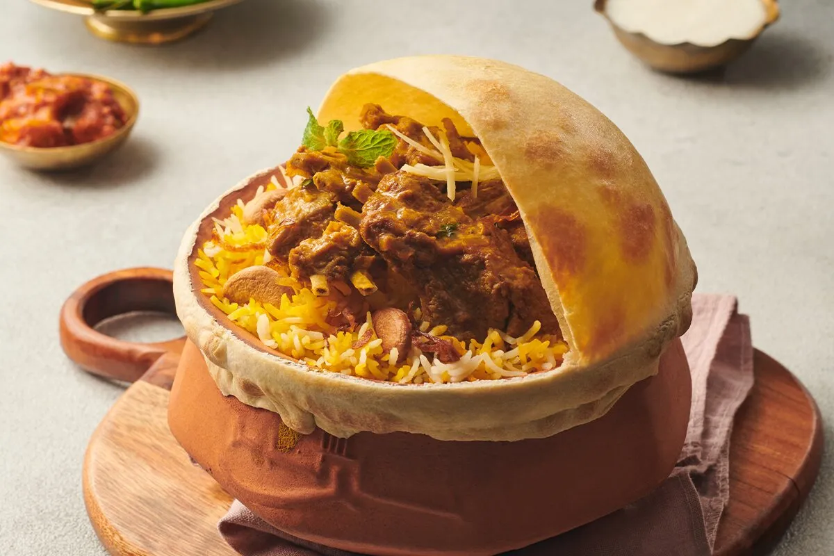 The kitchen is anchored in Mughlai and dum-style cooking, and the biryani is the dish most orders revolve around - chicken, mutton and Kashmiri versions, slow-cooked in the pot and served with the seal intact. Chicken malai tikka, murgh chatpata and Afghani kebabs lead the tandoor section, while dal makhani, butter chicken and baked lamb in bread crust are the dependable picks from the curry side. Vegetarians are well looked after, with stuffed mushrooms, paneer tikka and a strong vegetable biryani, and phirni and shahi tukda close the meal on a traditional note. Taftan and naan come from the tandoor; fresh mango juice is the drink to ask for in season.