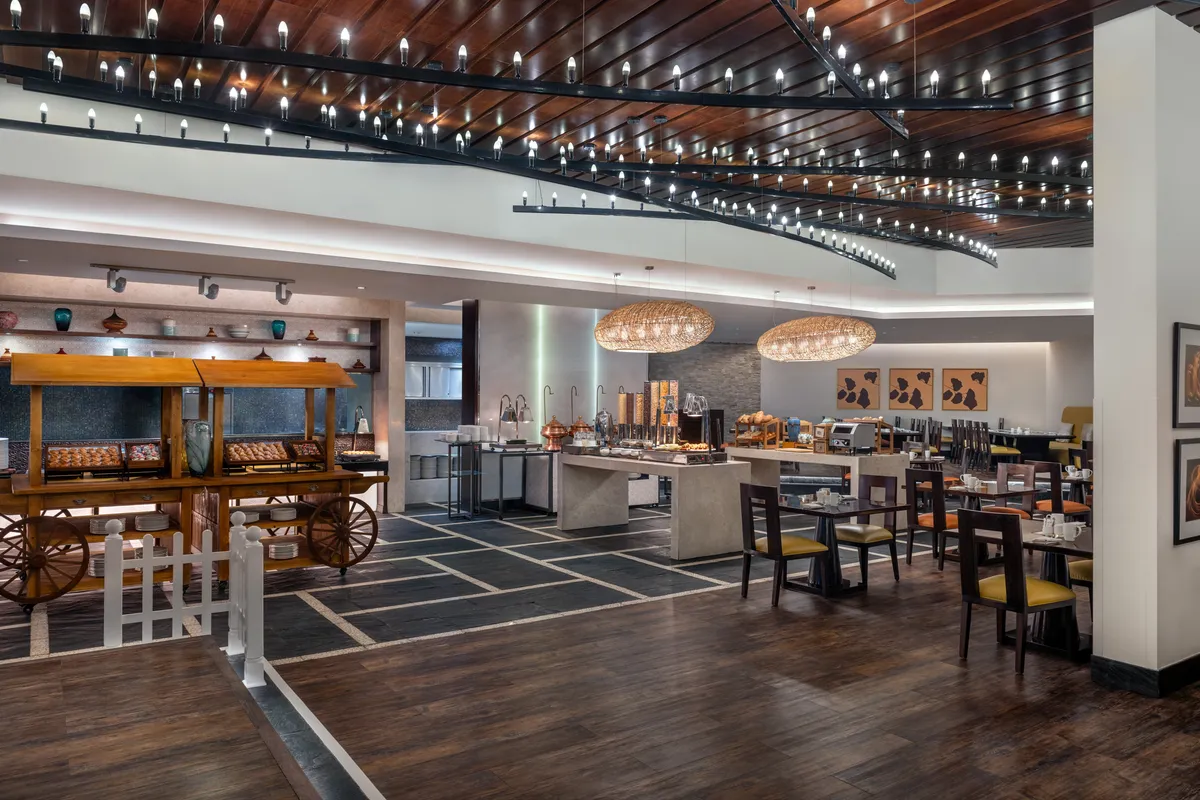 الصيغة هي السمة الأوضح للصالة. تغطي محطات منفصلة المتوسطي والشرق الأقصى والكوري والهندي واللبناني وعدّاد حلويات ومعجنات يبقيه فريق الحلويات منتعشاً طوال الخدمة. الإفطار قوي بصدق، ببرنامج خبز سليم، بيض حسب الطلب، شاركوتيري كاملة، وبار إسبريسو يتعامل مع قهوة على مستوى حرفي إلى جانب عصائر طازجة. يتناوب العشاء عبر ليالٍ مواضيعية، مع خدمة المأكولات البحرية في عطلة نهاية الأسبوع كموعد مميز - محار، قريدس، وشواء حي يرتقي فوق المعيار التقليدي لبوفيه الفندق.